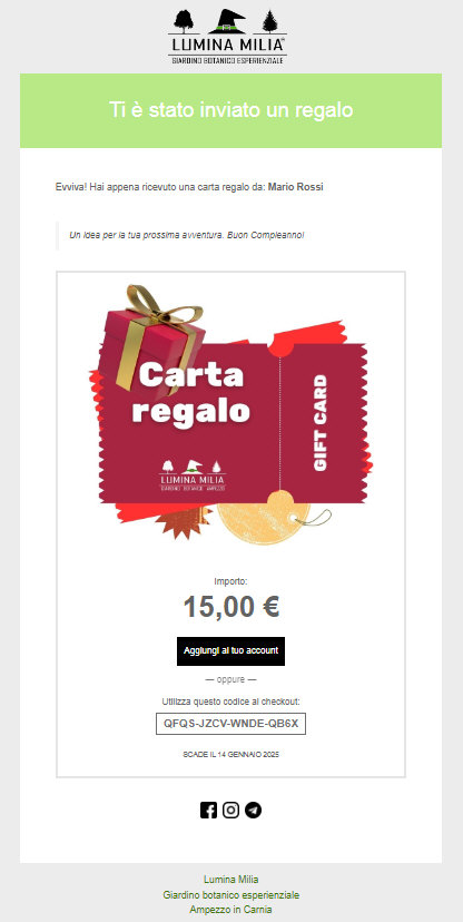 La Gift card non è nominale, è al portatore. Nel momento in cui viene emessa è associata a un codice con il credito dell’importo scelto. Chi riceve il codice è l’unico responsabile per il suo utilizzo e la sua custodia.